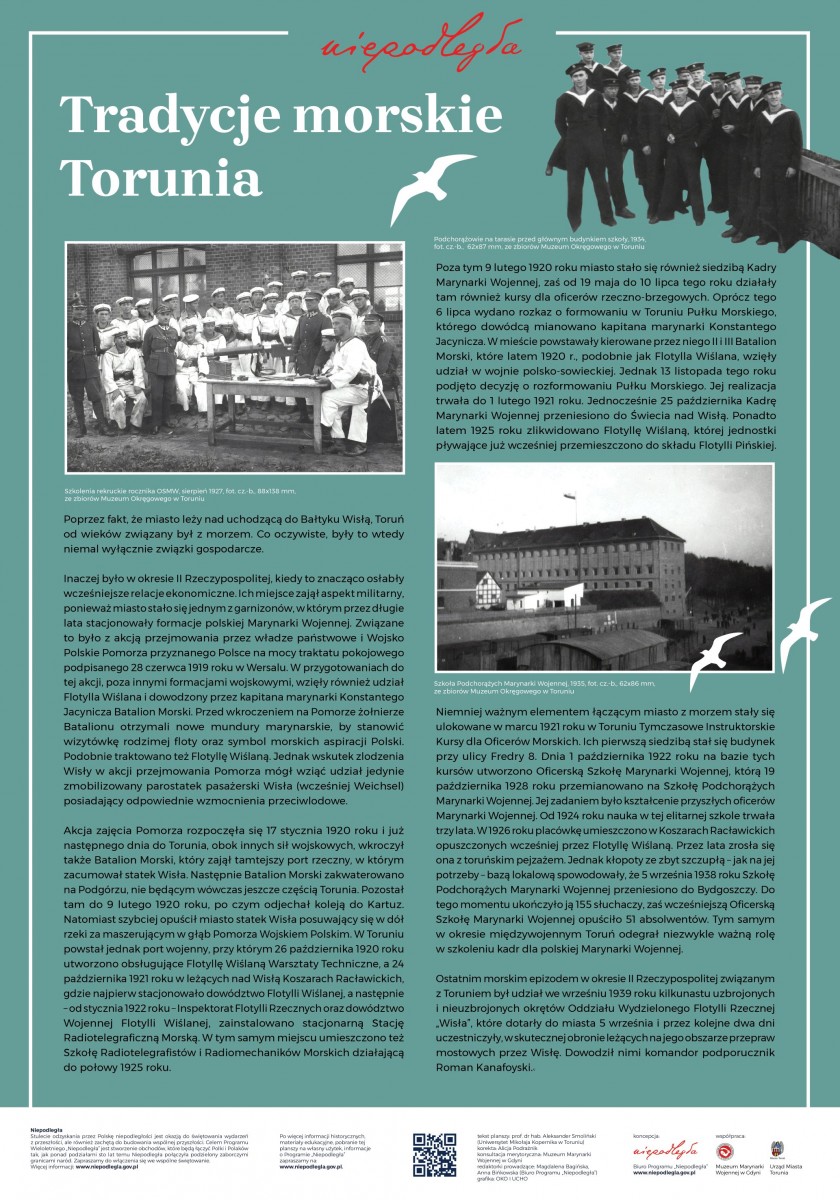 Wystawa „Polska morska Niepodległa” przypomina najważniejsze fakty, osoby i miejsca związane z historycznymi zaślubinami Polski z morzem, a także ukazuje w materiałach archiwalnych najsłynniejsze jednostki pływające pod polską banderą. Ekspozycja została przygotowana przez Biuro Programu „Niepodległa” we współpracy z Muzeum Marynarki Wojennej w Gdyni oraz Miastem Toruniem.