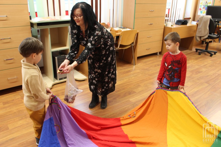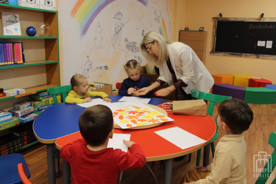 Za nami pierwsze, po wakacyjnej przerwie, spotkanie Klubu Małego Czytelnika. Pomimo szarugi za oknem, było wesoło i kolorowo, gdyż jego tematem była jesień — najbarwniejsza pora roku. Czy jesienne spotkania mogą odbyć się bez zabaw z liśćmi? Oczywiście, że nie! Mali Klubowicze rozpoznawali, z jakich drzew pochodzą listki, a następnie łączyli je z obrazkiem, by wykleić z nich piękną suknię Pani Jesieni. Wiersz „Las jesienią” autorstwa Katarzyny Moryc był okazją do rozmowy o oznakach tej pięknej pory roku. Nie zabrakło również grzybobrania. Z naszymi milusińskimi wybraliśmy się na „spacer” po Czytelni dla Dzieci i Młodzieży, aby nazbierać specjalnie na ta okazję ukrytych grzybów i kasztanów, które posłużyły nam do zabawy z chustą animacyjną.
