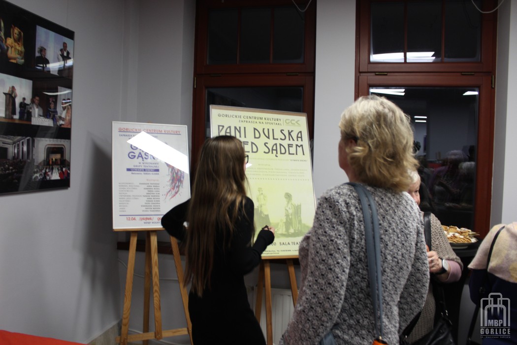 W czwartek (1 grudnia) Miejska Biblioteka Publiczna w Gorlicach zamieniła się w… teatr! W oknach kamienicy pojawiła się galeria portretów aktorów w strojach scenicznych, a wnętrze „zaroiło” się od teatralnych rekwizytów. Nie mogło zabraknąć kurtyny! Zawieszona pomiędzy piętrami „witała” gości przybyłych na wernisaż jubileuszowej wystawy Grupy Teatralnej „Otwarte Drzwi”.