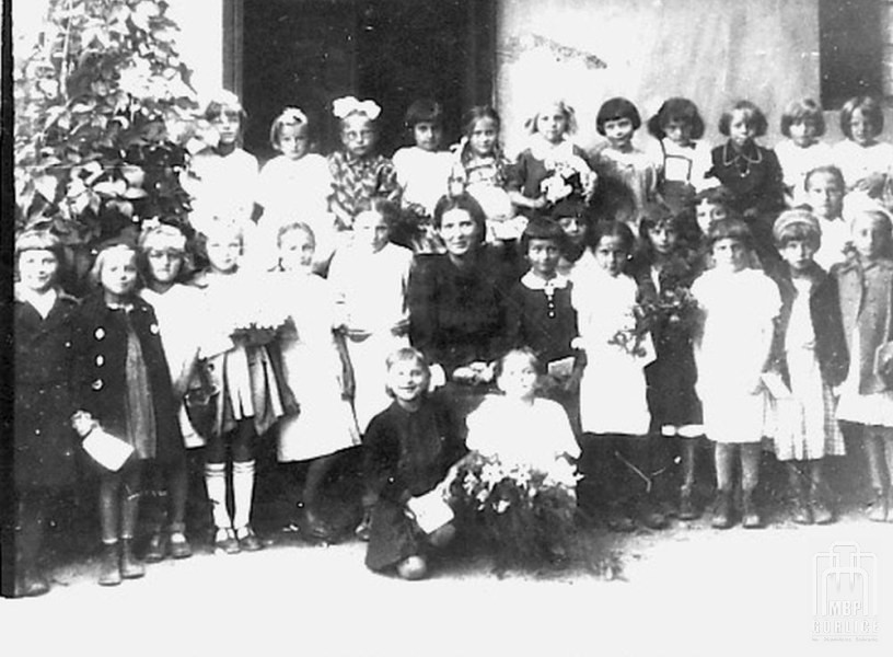 Klasa Szkoły Podstawowej w Libuszy z nauczycielką panią Sławoszewską; z kwiatami Danuta; ok. 1942 rok
