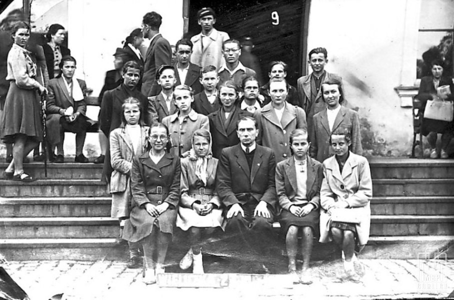 11. Liceum ogólnokształcące w Bieczu z nauczycielem matematyki panem Lamelem; Danuta w pierwszym rzędzie druga od prawej