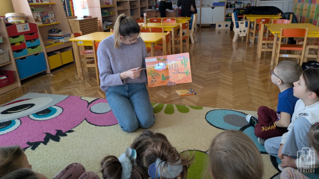 W środę, 5 lutego bibliotekarki ponownie odwiedziły grupę przedszkolaków z Miejskiego Przedszkola Nr 1 w Gorlicach. Spotkanie rozpoczęło się od głośnego czytania książki Myszonek pomaga w domu, autorstwa Riikki Jäntti. Dzieci z zaciekawieniem słuchały opowieści o małej myszce, która dopiero co uczy się pomagać w codziennych obowiązkach domowych. Książka w prosty i zabawny sposób przekazała przedszkolakom, jak ważna jest współpraca w rodzinie oraz że każdy z domowników – nawet najmłodszy – może przyczynić się do utrzymania porządku w domowej przestrzeni. Po zakończeniu lektury, dzieci miały okazję podzielić się swoimi doświadczeniami związanymi z pomocą w domu. Niektóre opowiedziały jak pomagają w sprzątaniu, nakrywaniu do stołu czy podlewaniu roślin, a inne z radością opisały swoje ulubione zajęcia domowe. Następnie przedszkolaki zostały zaproszone do obejrzenia książki Odkrywaj świat z magiczną latarką. Publikacja jest przepełniona ilustracjami, które zachęciły dzieci do aktywnego uczestnictwa w zabawie. Jej każda strona została wzbogacona o elementy, które dzieci mogły „odkrywać” za pomocą dołączonej latarki. Dzięki temu stała się ona nie tylko zwykłą opowieścią, ale także interaktywnym doświadczeniem, które pobudzało wyobraźnię i ciekawość świata. Przedszkolaki miały okazję przyjrzeć się detalom ilustracji, a także zgadywać, co kryje się za kolejnymi, tajemniczymi obrazkami. Spotkanie zakończyło się zabawą ruchową.