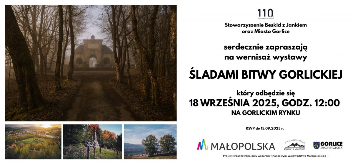 W imieniu Stowarzyszenia „Beskid z Jankiem” serdecznie zapraszamy na wernisaż wystawy „Śladami Bitwy Gorlickiej”, zrealizowanej w ramach zadania publicznego Województwa Małopolskiego w dziedzinie turystyki krajoznawstwa w 2025 r., pn. „Małopolska Gościnna – edycja II”, pod tą samą nazwą.