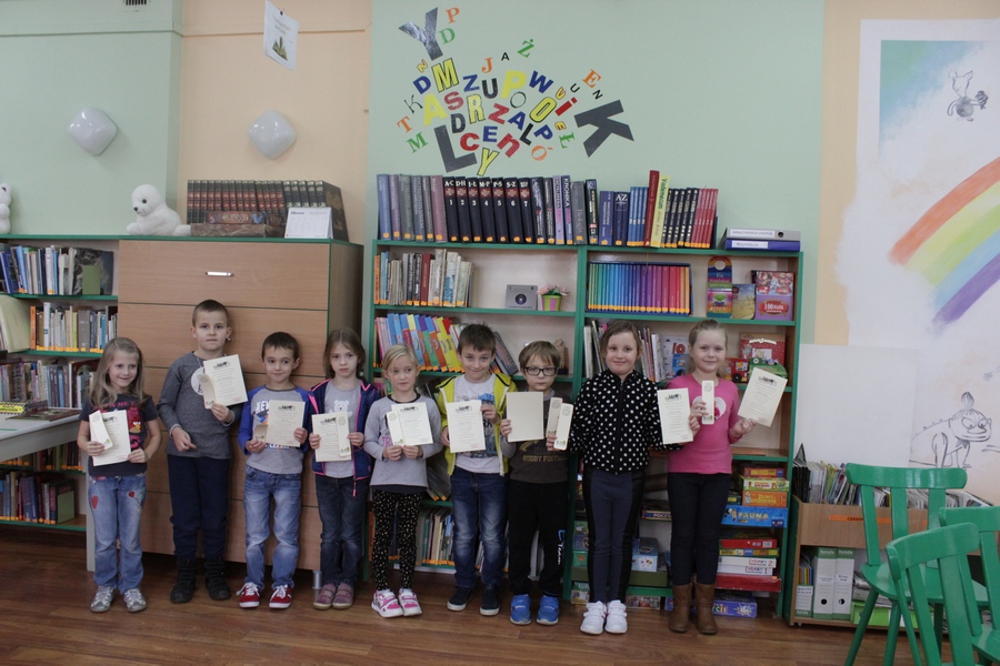 „W bibliotekach można czytać, ale nie tylko…” Pierwszoklasiści postawili pierwsze kroki w świecie książki i zostali oprowadzeni po bibliotece. W Wypożyczalni dla Dzieci zapoznali się z różnorodnym księgozbiorem. Mogli zobaczyć, jak są poukładane książki i gdzie mogą znaleźć ulubione lektury. Na podstawie fragmentu książki Jaś Czytalski w bibliotece i kolorowego abecadła dowiedzieli się, jak należy dbać o książki, aby długo służyły innym czytelnikom. Przed pasowaniem był przeprowadzony miniquiz, w którym uczniowie musieli się wykazać podstawowymi wiadomościami dotyczącymi korzystania z książek i innych zbiorów bibliotecznych. Odgadywali także bajkowe zagadki, które sprawdziły ich wiedzę o bohaterach baśni i wierszy. Następnie wszyscy uczestnicy złożyli ślubowanie, przyrzekając, że będą szanować książki, dużo czytać i często nas odwiedzać. Każdy uczeń został uroczyście pasowany na czytelnika i otrzymał pamiątkowy dyplom oraz zakładkę.