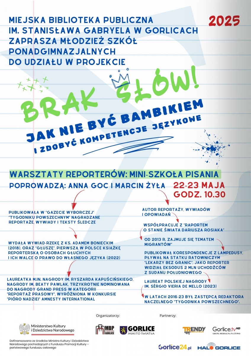 Miejska Biblioteka Publiczna im. Stanisława Gabryela w Gorlicach zaprasza młodzież szkół średnich do udziału w „Warsztatach reporterów: Mini-szkoła pisania”, które odbędą się 22 maja 2025 (czwartek), o godz. 10.30. Zajęcia poprowadzą: Anna Goc i Marcin Żyła.