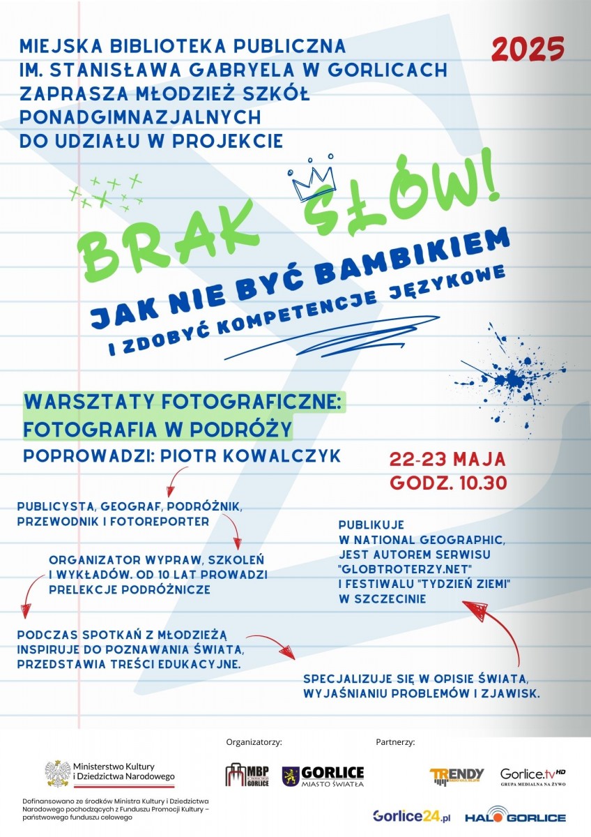 Miejska Biblioteka Publiczna w Gorlicach uzyskała dofinansowanie Ministra Kultury i Dziedzictwa Narodowego na realizację projektu pn. „Brak słów! Jak nie być bambikiem i zdobyć kompetencje językowe” w ramach programu „Edukacja kulturalna”.