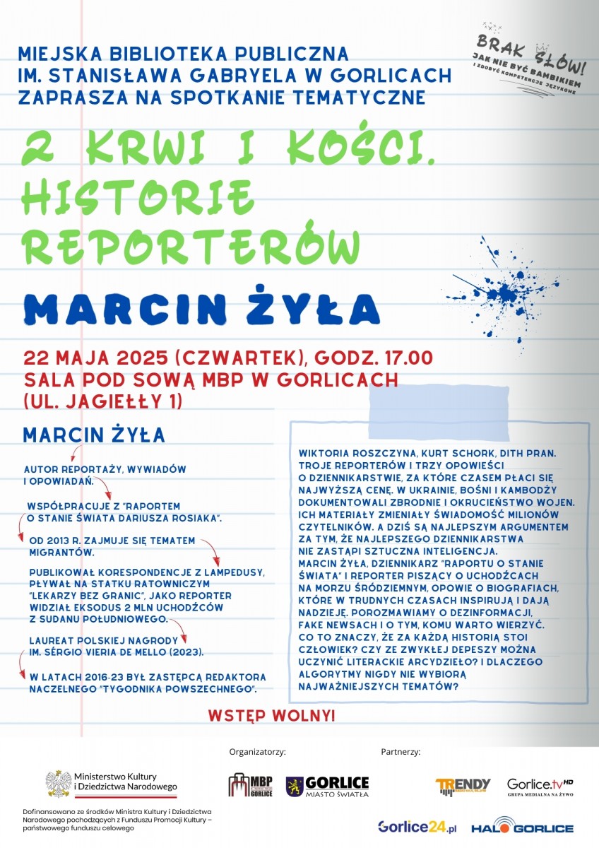 Miejska Biblioteka Publiczna im. Stanisława Gabryela w Gorlicach zaprasza na spotkanie tematyczne z Marcinem Żyłą pt. „Z krwi i kości. Historie reporterów”, które odbędzie się 22 maja 2025 (czwartek), o godz. 17.00 w sali Pod Sową MBP w Gorlicach (ul. Jagiełły 1).