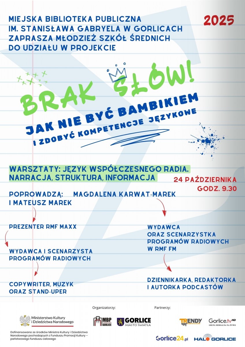 Miejska Biblioteka Publiczna im. Stanisława Gabryela w Gorlicach organizuje warsztaty pt. „Język współczesnego radia. Narracja, struktura, informacja”, które odbędą się 24 października 2025 (piątek), o godz. 9.30. Zajęcia poprowadzą: Magdalena Karwat-Marek i Mateusz Marek.